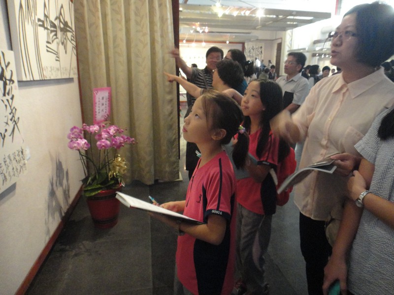 While Chun-lin and his/her mother were enjoying displayed artworks at the exhibition, a warmhearted senior member of a calligraphy club initiated to guide them. Meanwhile, Jou-wei and his/her parent ran into a lady, who curiously asked Jou-wei what s/he was studying on. Elementary school students showing up at a calligraphy exhibition did cause a rumpus!