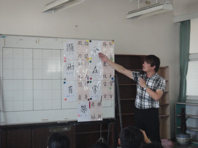 It was past five o’clock on a Friday afternoon when two persons walking to the teachers’ lounge at the same time for photocopying started their interaction. The conversation began with Ruo-cih’s calligraphy learning and competitions, slowly switched to the sequence of the 12-year compulsory education, and returned to reasons why we were both at work at such a late time. After maneuvering myself into the history of Teacher Chih-lung’s involvement with calligraphy, I got to know that Teacher Chih-lung’s, who had been an avid and diligent calligraphy lover for over 20 years, is an expert in “lishu” (Chinese calligraphy in official script) and a former winner at a teaching plan competition for creative calligraphy lessons. Teacher Chih-lung mentioned about deconstructing Chinese characters in calligraphy through a scientific and creative method, which wonderfully solved my predicament and struggle for a way to advocate “creative calligraphy”. It made me realize that my staying at my job was the God’s intention for me and my students to meet up with Teacher Chih-lung.